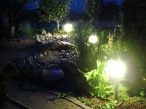 Разложил камни помельче, разложил щебенку, закопал столбы под фонари, подключил фонари и нехитрый пульт управления в 110 трубе. Подключил насос для фонтана, разложил песчаник, жена посадила зелень, залили воду в корыто, включил фонтан. Красота-а-а-а!