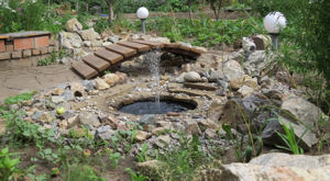 Сказано - сделано. Наметил участок, убрал верхний слой, проложил проводку, положил агроволокно, разложил большие камни. Сын выкопал яму под корыто, закопал корыто, сварил арки для мостика, покрасил, обрезал доски для мостика, вскрыл морилкой, вскрыл маслом, прикрутил к мостику, поставил мостик на место.